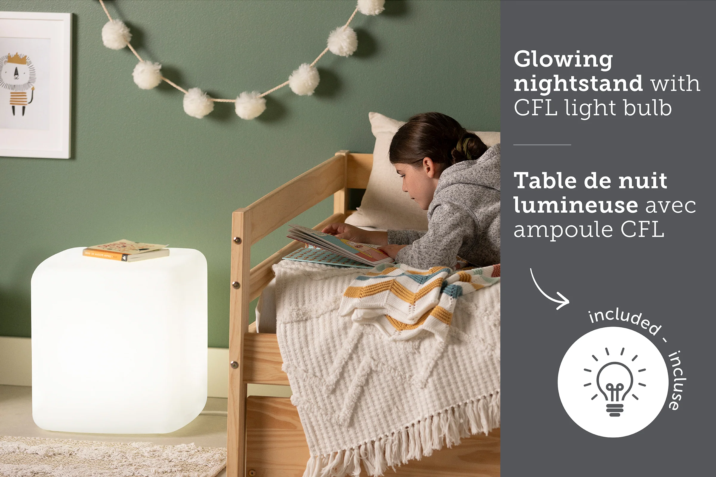 • UNE TABLE DE NUIT ÉLECTRIQUE: en plus d’être pratique, cette table de nuit s’illumine! Une ampoule fluo-compacte (CFL) y est intégrée et diffusera une ambiance douce et chaleureuse dans la chambre de votre tout-petit. Elle pourra aussi servir de veilleuse ou encore de lumière pour la lecture. Et ne vous inquiétez pas, même si la table est lumineuse, elle ne devient pas chaude. Sécurité avant tout!