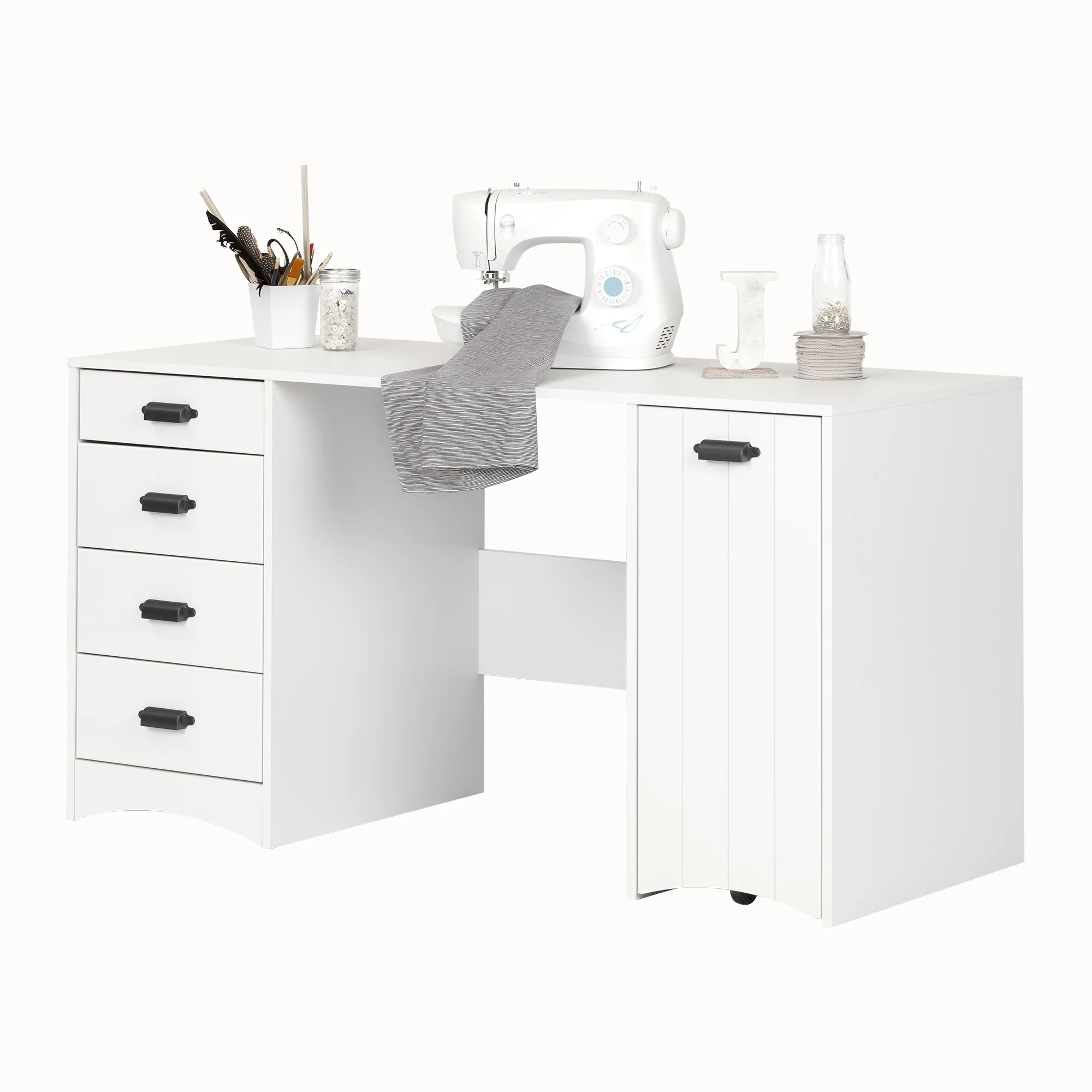 Fabriquez vos plus belles créations grâce à cette table de couture ultra pratique! Sa grande surface résistante aux égratignures et à l’eau vous permettra de bien vous installer pour réaliser vos projets, et les trois tiroirs vous permettront de garder ciseaux, tissus et autres outils près de vous. Vous pourrez aussi utiliser la tablette coulissante pour bien ranger vos bobines de fil étant donné qu’elle est munie de goujons amovibles spécialement ajoutés pour cette raison. Finalement, un module de rangement coulissant a aussi été ajouté. Il possède deux espaces de rangement, ce qui va vous permettre de garder hors de vue votre machine à coudre, votre fusil à colle, ou autres appareils.