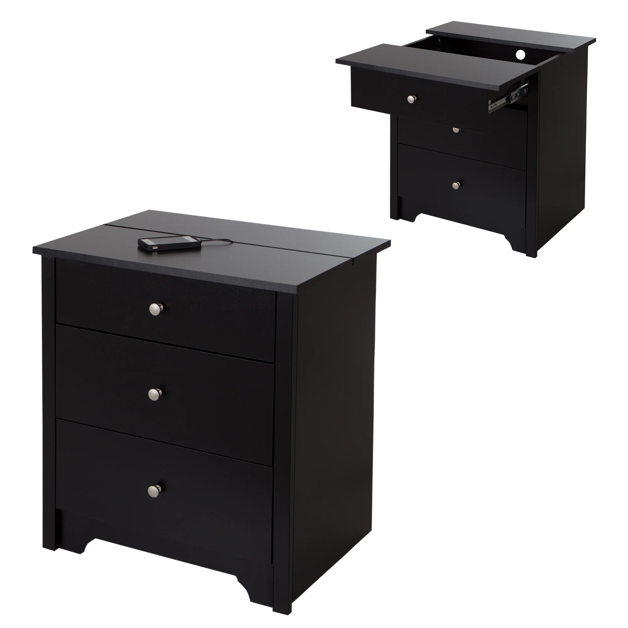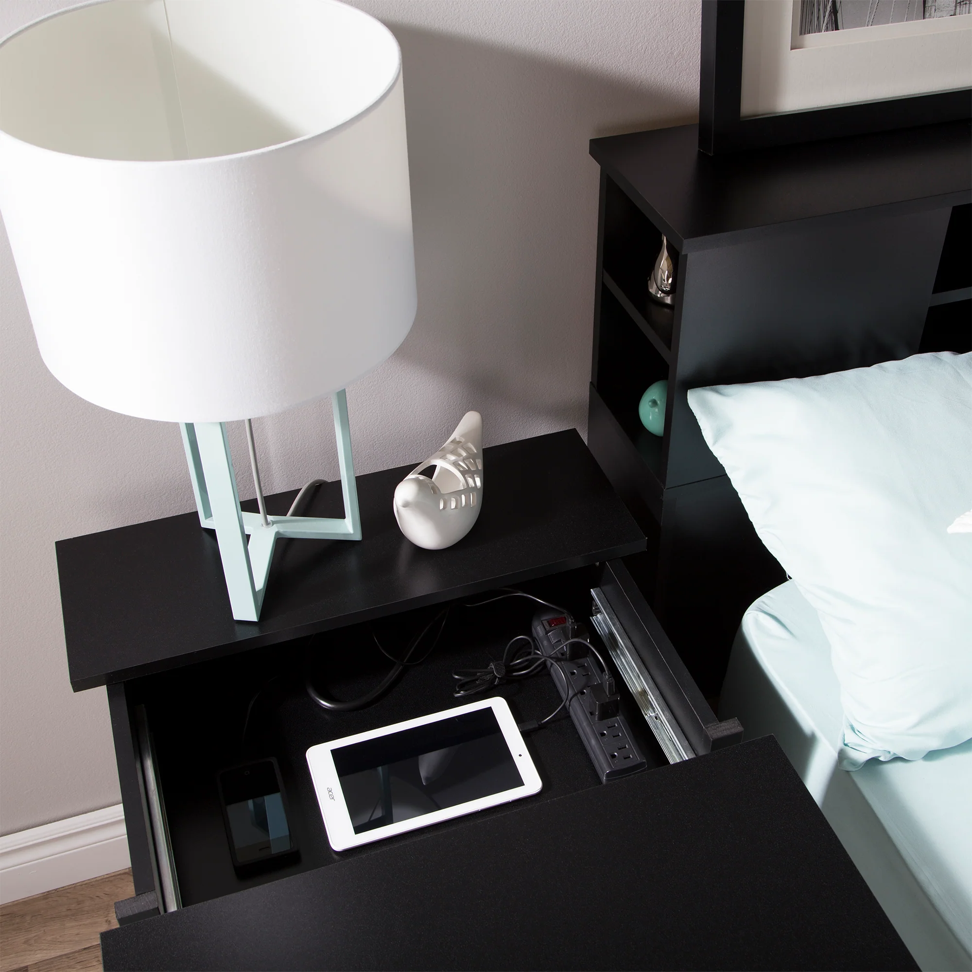 • STATION DE CHARGEMENT INTÉGRÉE : à l’aide du plateau coulissant, dissimulez les câbles désordonnés en gardant vos appareils chargés et à portée de main dans cette élégante armoire de chambre à coucher.