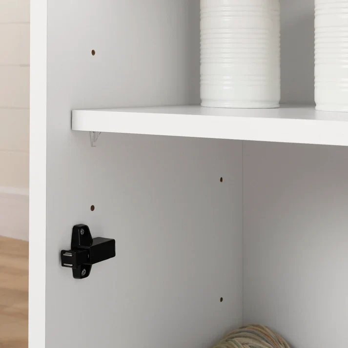 Un des modules est constitué de dix compartiments ouverts séparés par huit divisions ajustables, ce qui vous permettra de les placer en angle si vous le souhaitez. Vous retrouverez aussi deux supports à rubans dans les espaces du dessus. En plus de ces compartiments, vous obtenez un tiroir au centre et deux espaces séparés par une tablette amovible derrière la porte de l’armoire. Dans l’autre module, cinq compartiments de dimensions variables sont accessibles sous des angles différents et il y a un petit bac pour ranger des rouleaux. Votre matériel d’art sera enfin bien organisé!