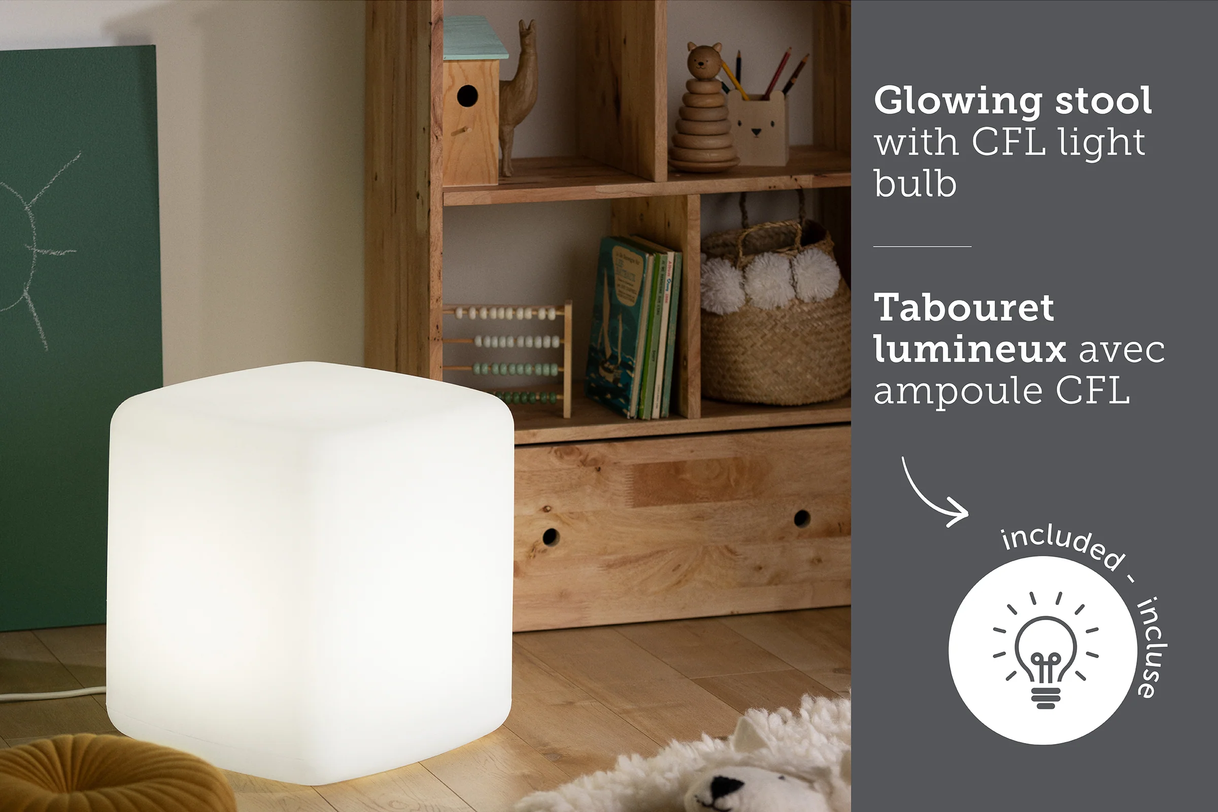 • BANC AVEC LUMIÈRE INTÉGRÉE: vos bout’chous adoreront cette assise, parce qu’elle s’illumine! Ils n’auront qu’à la brancher à une prise électrique pour que l’ampoule fluo-compacte (CFL) incluse ne s’active. En plus, elle ne devient pas chaude lorsque la lumière est allumée. Vos enfants seront en sécurité!