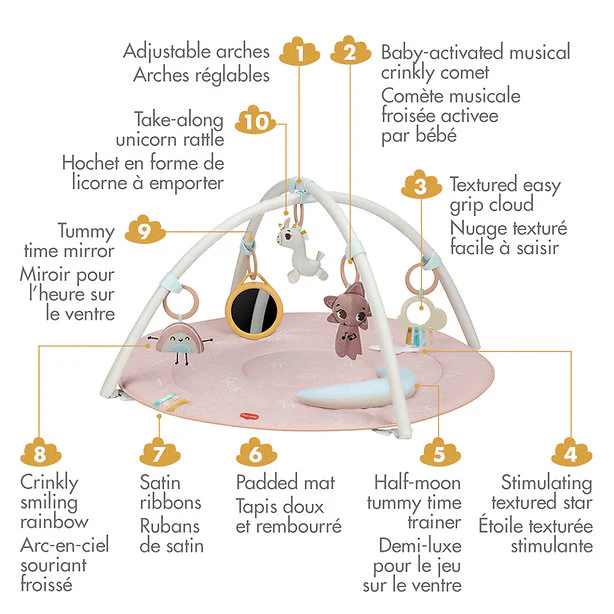 Découvrez le tapis d’éveil Unicorn Wonderlands de Tiny Love, spécialement conçu pour soutenir le développement naturel de votre bébé. Ce tapis de jeu enchanteur offre un environnement idéal pour la stimulation visuelle, auditive et tactile, ce qui est important pour promouvoir les sens et la motricité.
