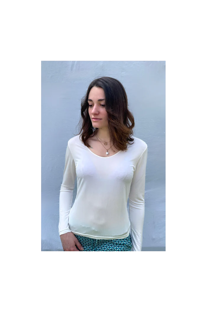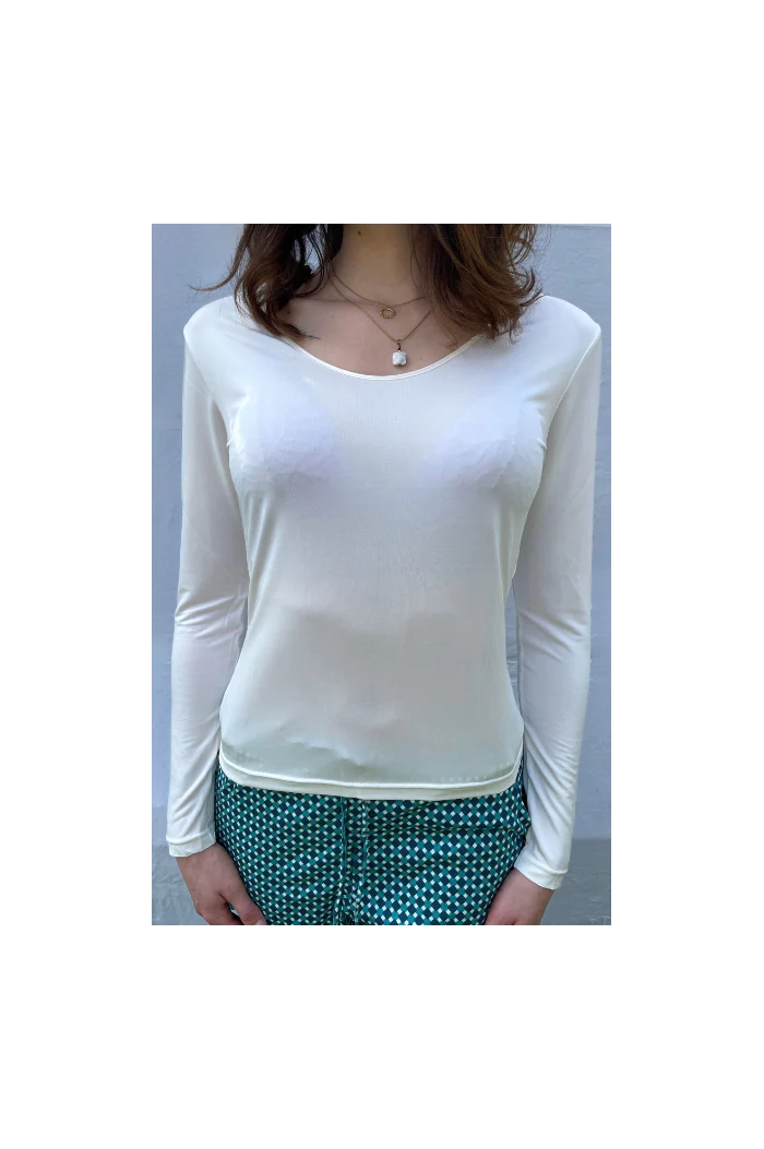 Tee-shirt écru manches longues en 100 % Jersey de soie avec une encolure arrondie en biais satin vous apporte confort et chaleur. Thermorégulante, la soie apporte chaleur l’hiver et fraîcheur l’été. De la lingerie en soie féminine raffinée indispensable en toutes saisons.