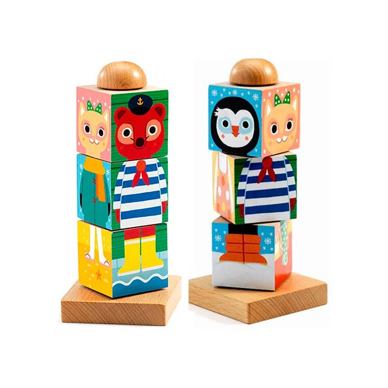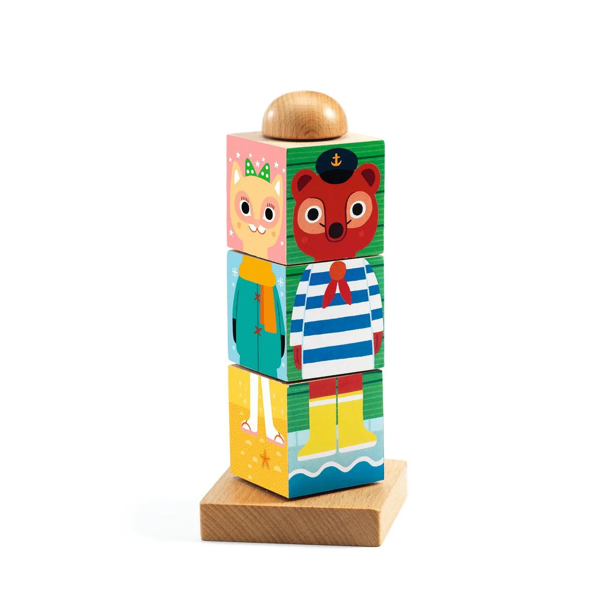 Recommandé aux enfants à partir de 2 ans, Twistanimo comprend 3 cubes en bois encastrés le long d’une tige en bois et reposant sur un socle carré. Chaque face de chaque cube est imprimée et représente la tête, le corps et les jambes de 4 animaux rigolos : un chat, un ours, un lapin et un pingouin.
