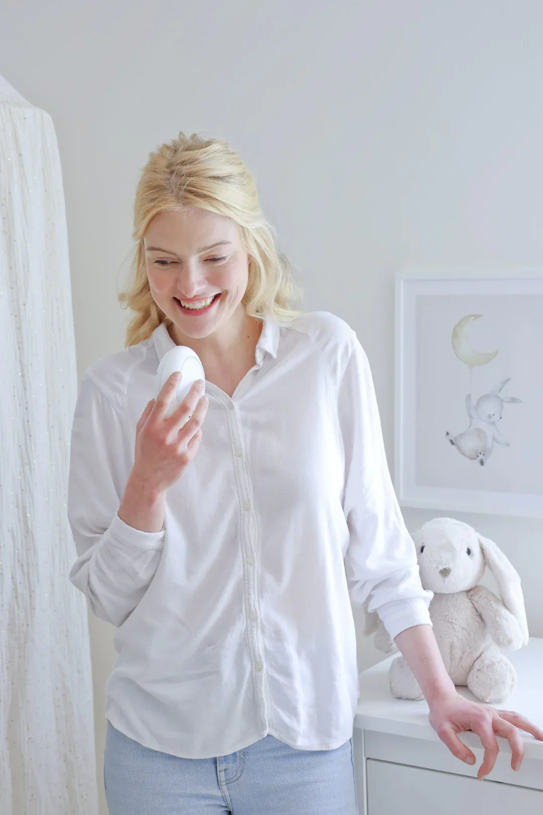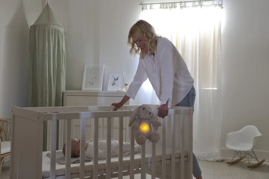 De plus, Billy le Lapin s’illumine d’une lueur chaleureuse qui pulse doucement pour apaiser les tout-petits, avec 5 couleurs et 2 effets lumineux. Pratique, grâce au détecteur de mouvement Shake&Play, une simple secousse de la peluche permet de redémarrer la lumière, les berceuses et le message sonore enregistré par les parents.