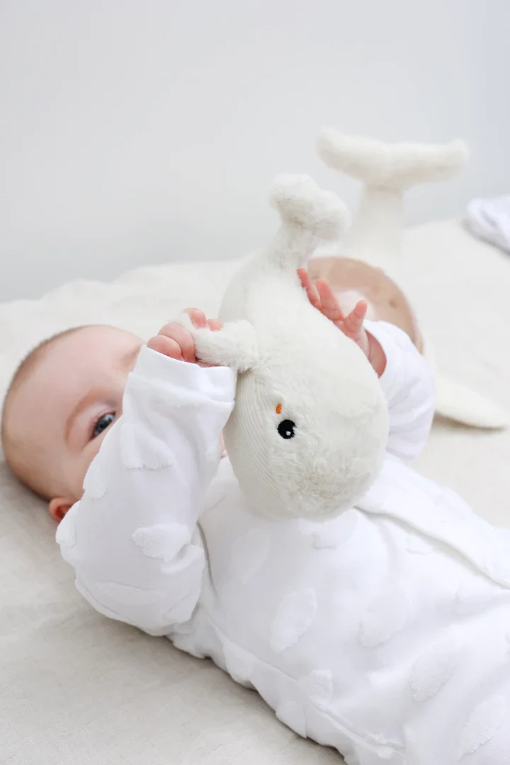 La veilleuse Tranquil Whale apaise bébé dès sa naissance et rassure les enfants qui ont peur du noir. Douce peluche la journée, elle se transforme en veilleuse la nuit venue. Une mélodie marine et le son des vagues (bruit blanc) apaiseront bébé pour un sommeil relaxant. Son effet de lumière sous-marine est magique grâce aux projection de vagues en mouvements.