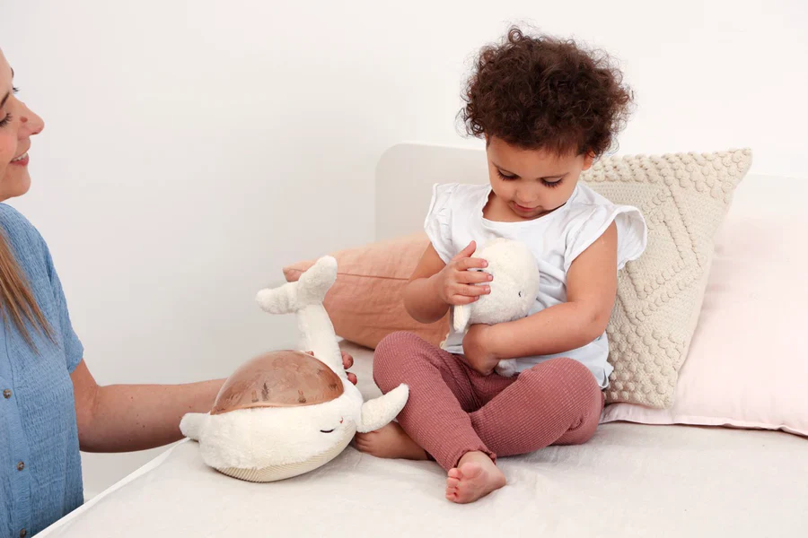 Cette veilleuse est en fait une jolie baleine qui diffuse une douce lumière et projette sur le plafond de la chambre les vagues de l’océan en mouvement, grâce à un mécanisme unique et breveté. La peluche baleineau émet un joli son de grelot quand bébé la secoue, il peut l’emporter partout avec lui.